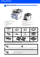 Getting Started 1 1 Carton components 10 1 9 8 2 3 4 5 7 6 11 1 Automatic Document Feeder (ADF) 7 Power Switch 2 Control Panel 8 ADF Document Output Support Flap 3 Front Cover Release Button 9 Document Cover 4 USB Direct Interface 10 Face-down Output Tray Support 5 Front Cover 11 Multi-purpose tray (MP tray) 6 Paper Tray CD-ROMs For Windows® For Macintosh® AC Power Cord Waste Toner Box (pre-installed) Quick Setup Guide User’s Guide Telephone line Cord Telphone Line Cord Adapt