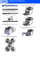 STEP 1 Setting Up the Machine 2 1 2 3 Installing the toner cartridges Repeat steps 1 through 3 for the remaining toner cartridges. 5 Put the drum unit back into the machine. 6 Close the front cover of the machine. Unpack the toner cartridges and gently shake each toner cartridge from side to side 5 to 6 times. Pull off the protective cover. Hold the handle of the toner cartridge and slide it into the drum unit.