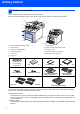 Getting Started 2 Control panel MFC-9840CDW 2 1 3 5 4 6 05/01/2008 18:00 Fax Only Sleep 12 11 10 9 1 One Touch keys 7 Start keys 2 LCD (Liquid Crystal Display) 8 Copy keys 3 Status LED 9 Duplex key 4 Menu keys 10 Mode Keys 5 Dial Pad 11 Fax and Telephone keys 6 Stop/Exit key 12 Print keys 8 7 For the details of the control panel, see Control panel overview in Chapter 1 of the User’s Guide. Note This machine is heavy and weighs 38 kg (83.6 lb).