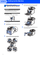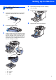 Setting Up the Machine 2 1 2 3 Installing the toner cartridges 4 Repeat steps 1 through 3 for the remaining toner cartridges. 5 Put the drum unit back into the machine. 6 Close the front cover of the machine. Unpack the toner cartridges and gently shake each toner cartridge from side to side 5 to 6 times. Pull off the protective cover. Hold the handle of the toner cartridge and slide it into the drum unit.