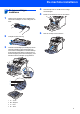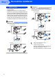 De machine installeren 4 1 2 Het bedieningspaneel/deksel bevestigen 6 1 Open het documentdeksel. Het netsnoer en telefoonsnoer aansluiten Controleer of de machine is uitgeschakeld. Verwijder het label op de stroomingang. Kies uw taal en bevestig het bedieningspaneel op de machine. 2 Sluit het netsnoer aan op de machine. Opmerking Als het bedieningspaneel niet op de juiste wijze wordt bevestigd, werken de toetsen op het bedieningspaneel niet.