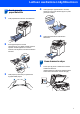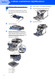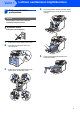 Vaihe 1 Laitteen asettaminen käyttökuntoon 1 1 Pakkausmateriaalien purkaaminen 4 Tartu rumpuyksikön vihreään kahvaan. Nosta rumpuyksikkö ylös ja vedä sitä ulos, kunnes se pysähtyy. Tärkeää Säilytä pakkausmateriaalit ja laatikko mahdollista kuljetusta varten. Sopimaton asetus ÄLÄ kytke vielä sähköjohtoa. 1 2 Poista pakkausteippi laitteen ulko-osasta. Avaa etukansi painamalla etukannen vapautusvipua. 5 3 Poista oranssi pakkausmateriaali kuvan osoittamalla tavalla.