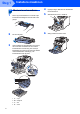 Steg 1 Installera maskinen 2 1 2 3 Montera tonerkassetterna Packa upp tonerkassetterna och skaka varje tonerkassett försiktigt från sida till sida 5 till 6 gånger. Dra bort skyddet. Håll i handtaget på tonerkassetten och skjut in den i trumman. Kontrollera att du monterar tonerkassetten med den färg som visas på färgdekalen på trumman och kom ihåg att fälla ned tonerkassettens handtag (1) när tonerkassetten sitter på plats.
