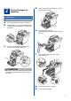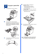 2 Fjern emballagen fra maskinen d Hold i tromlens grønne håndtag a, og træk den ud, indtil det stopper. VIGTIGT! Tilslut IKKE netledningen endnu. a b c Fjern emballeringstapen uden på maskinen. Åbn MP-bakken a, og fjern plastikarket b fra understøtningen til MP-bakken, og luk derefter MP-bakken. e Træk forsigtigt det orange indpakningsmateriale mod maskinens front, og fjern det. Tryk på udløserknappen til frontklappen, og åbn den. Fjern silikagel-pakken a.