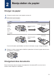 2 Manipulation du papier Charger du papier 1 Chargez du papier dans le bac à papier comme suit. Ventilez bien la pile de papier. Bac 1 Comment charger du papier Lettre/A4 Legal Réglez les guidespapier. Exécutif A5/A6 Surface d'impression : Face vers le bas Photo 2L Fiche Enveloppes Photo Surface d'impression : Face vers le bas Réglez les guidespapier. Pour de l'information plus détaillée uu Guide de l'utilisateur en ligne: Charger du papier 2 Dépliez le volet du support papier.