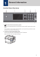 1 General Information Control Panel Overview 1 2 3 4 5 6 1. NFC (Near Field Communication) symbol You can use card authentication by touching the IC card to the NFC symbol on the control panel. If your Android™ device supports the NFC feature, you can print from your device or scan documents to your device in the same way. 2. Touchscreen Liquid Crystal Display (LCD) Access menus and options by pressing them on the Touchscreen. Adjust the angle of the control panel by lifting it.