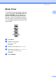 General setup Mode Timer 1 1 The machine has four temporary mode keys on the control panel: FAX, SCAN, COPY and PHOTO CAPTURE. You can change the amount of time the machine takes after the last Scan, Copy or PhotoCapture operation before it returns to Fax mode. If you choose Off, the machine stays in the mode you used last by default. a b Press Menu. Press a or b to choose General Setup. Press OK. c d Press a or b to choose Mode Timer. e Press Stop/Exit.
