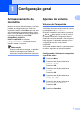 Configuração geral Modo Espera Display LCD Você pode selecionar por quanto tempo o aparelho necessita ficar inativo (de 1 a 60 minutos) antes de entrar no modo Espera. O timer será reiniciado se qualquer operação for feita no aparelho. Configurando o brilho da retroiluminação a b Pressione Menu. Você pode ajustar o brilho da retroiluminação do display. Se tiver dificuldades lendo o display, tente alterar a configuração de brilho. Pressione a ou b para selecionar Config. Geral. Pressione OK.