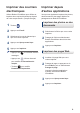 3 Imprimer Imprimer des photos stockées sur votre appareil mobile 1 Touchez . 2 Appuyez sur Photo. 3 Appuyez sur le fichier à imprimer. 4 Touchez Terminé. 5 Appuyez sur Imprimer. • Touchez pour modifier Paramètres d'impression. • Touchez pour modifier l'image. Imprimer des documents Imprimez des documents enregistrés sur la carte mémoire de votre appareil mobile. 1 Touchez 2 Touchez Documents. 3 Appuyez sur le fichier à imprimer. 4 Appuyez sur Imprimer. .