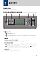 1 일반 정보 제어판 개요 제어판은 모델에 따라 다를 수 있습니다. DCP-L3510CDW/DCP-L3551CDW 1 1. 2 3 4 5 6 전원 On/Off • 을 눌러 제품을 켭니다. • 을 길게 눌러 제품을 끕니다. LCD가 꺼지기 전에 몇 초 동안 [시스템 종료 중]이 표 시됩니다. 2. 기능 버튼 Copy/Scan Options (복사/스캔 옵션) 스캔 또는 복사용 임시 설정에 액세스하려면 누릅니다. WiFi (무선 모델의 경우) WiFi 버튼을 누르고 컴퓨터에서 무선 설치 프로그램을 실행합니다. 화면 지침에 따라 제품 과 네트워크 간에 무선 연결을 설정합니다. WiFi 조명이 켜지면 Brother 제품이 무선 액세스 포인트에 연결됩니다. WiFi 조명이 깜박 이면 무선 연결이 끊기거나 제품이 무선 액세스 포인트에 연결 중입니다. Scan (스캔) 제품을 스캔 모드로 전환하려면 누릅니다.