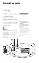 Quick set-up guide 1. Plug in 1. Plug the mains power adaptor into the base, with the cable clipped in the groove provided. 2. Plug the other end of the power adaptor into the wall power socket and switch on. The phone line cord is pre-installed but don’t plug the other end into the wall socket yet. Important • Don’t connect the phone line to a phone socket until the handset is fully charged. • The base station should be plugged into the mains power socket all the time.
