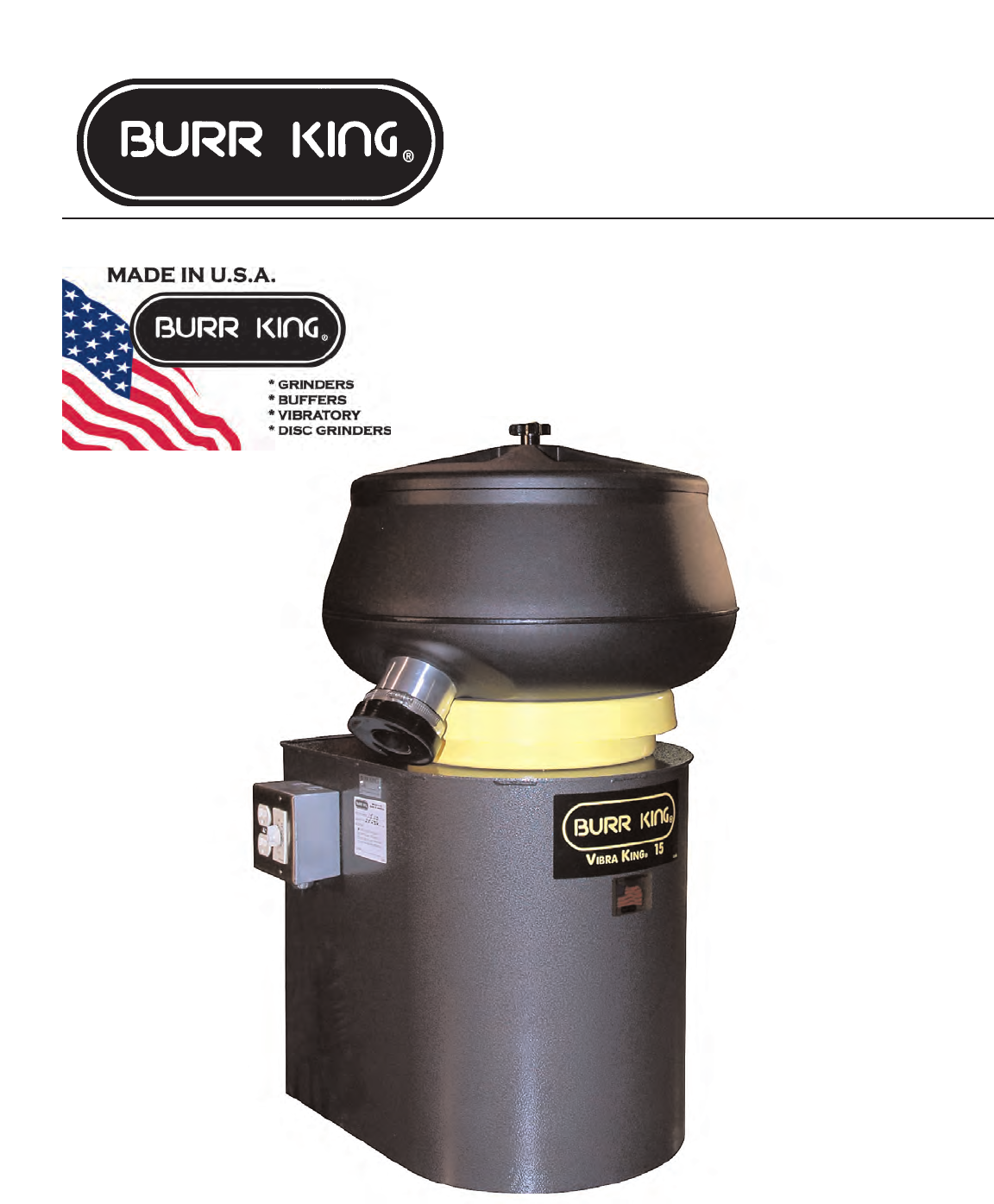 BURR KING MFG. CO., INC. 122 0 TAMARA LANE WARSAW MO 6 5355 WWW.BURRKING.COM (660) 438-8998 (800) 621-2748 FAX (660) 438-8991 December 2009 Operating instructions for Model 15 VibraKING ® The VibraKING 15 vibratory bowls are stand mounted vibratory processing machines. The bowls are compatible with ceramic, plastic, shell, cob, and most other media types. The bowls include a port for fluid induction, and a port for fluid draining.