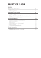 BURY CP 1100 Index Introductory information 1. General 2. Security guidelines Installation of the system 3. 4. 5. 6. Scope of supply Positioning and mounting Plug the cable for the BURY CP 1100 into the electronic box Connections on the electronics box Operating guidelines 7. Using the BURY CP 1100 for the first time 8. Handling possibilities 9. Voice control 10. Operating the menu using the keypad 11. Menu navigation 12. Accepting, making, ending calls Further Information 13. Service 14.