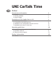 UNI CarTalk Time Index Introductory information 1. General 2. Security guidelines 3. Scope of supply Installation of the hands-free car kit 4. Positioning and mounting 5. Connections on the electronics box 6. Installation of the loudspeaker switch box AC 5120 7. Installation instructions for the fuses Operating guidelines 8. Using the hands-free car kit for the first time 9. Automatic switch off 10. Electronic driver‘s logbook Further Information 11.