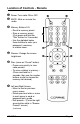 Location of Controls - Remote (Continued) • Add a preset: (Press the left arrow button and then the right arrow button). • Automatically tune to next or previous station in FM Radio mode. G H Up and Down Arrows: (same as dial knob). • Highlights next or previous item in a menu screen. • Scroll through letters, numbers, and special characters in word/password entry mode. • Plays next or previous station or song in the selected list. • Manually tunes FM Radio. OK: (same as “Select” button).