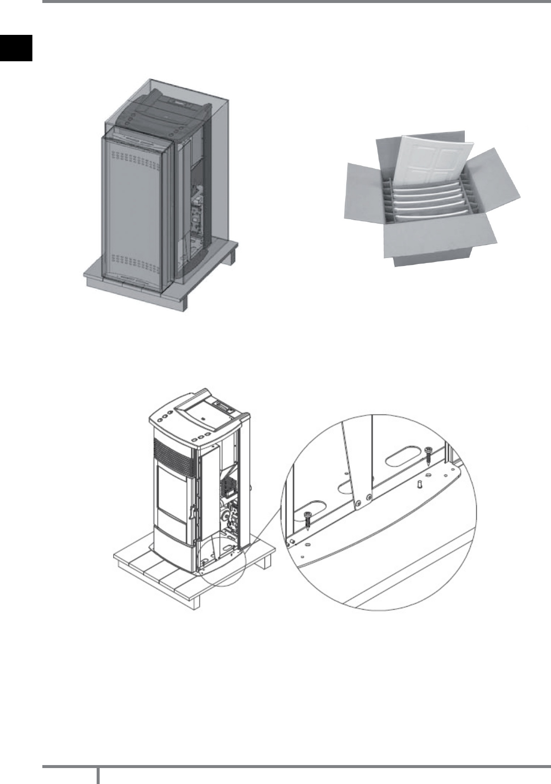 Ouvrir l’emballage, enlever les quatre vis qui xent la base du poêle à la plate-forme, deux sur la droite et deux