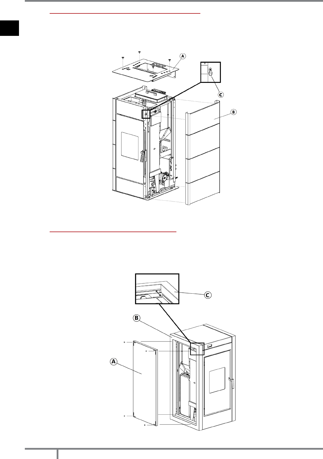 Prenez la coté (B) e xez-le au poêle: laissez tomber les trous de la coté sur les vis xées au poêle (C).