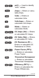milli- — Used to identify “milli-” values. Amps — Enters or calculates Amps. Volts — Enters or calculates Volts. Volt-Amps — Enters or calculates Volt-Amps. Watts — Enters or calculates Watts. DC Amps (Idc) — Enters or calculates DC Amps. DC Volts (Vdc) — Enters or calculates DC Volts. DC Resistance (R) — Enters or calculates DC Resistance in Ohms. Power Factor (PF%) — Enters or calculates Power Factor.