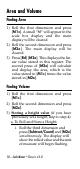 Area and Volume Finding Area 1) Roll the first dimension and press [M1+]. A small “M” will appear in the scale box display and the main display will be cleared. 2) Roll the second dimension and press [M2x]. The main display will be cleared. 3) Press [Rcl] [M2x]. This displays the linear value stored in this register. The second press of [M2x] will calculate and display the area, which is the value stored in [M1+] times the value stored in [M2x]. Finding Volume 1) Roll the first dimension and press [M1+].