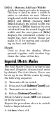 ii. If you do not want to change the unit of measure, go to step iii. To change the unit of measure, press [M1+] until you reach the desired unit. iii.Press [Scale] to advance through the flashing digits until the display returns to zero. The height is now stored. b. To Enter and Store a Height: i. If you are entering a height (instead of rolling), press [Subtract/Count] and [M2x] simultaneously. The unit of measure will begin flashing. ii. If you do not want to change the unit of measure, go to step iii.