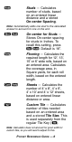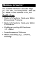 MATERIAL ESTIMATOR™ The Material Estimator calculator helps you save time, cut costly errors – and lets you measure and estimate like a pro! Quickly Solve: • Feet-Inch-Fractions, Yards, and Metric Dimensional Problems • Feet-Inch-Fractions, Yards, and Metric Conversions • Problems Involving All Fractions – 1/2-1/64ths! • Instant Areas and Volumes • Material Quantity (e.g.