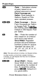 Project Keys P Paint — Calculates volume of paint, based on an entered area and a stored Paint Coverage per Gallon. Finds quantity in Gallons, Quarts or Pints upon repeated presses. sP Paint Coverage — Stores Paint Coverage per Gallon in Square Feet. To recall this setting, press v P. Default is 350 Square Feet per Gallon. T Tile — Finds the number of tiles, based on an entered area and a user-stored Grout Width.