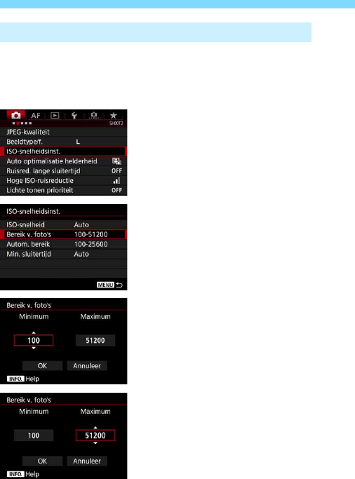 U kunt het ISO-snelheidsbereik handmatig instellen (er zijn minimum-