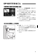 GPSの信号を受信する GPS信号の受信は、空が見通せる屋外にGP-E2を持っていき、GP-E2の 上面に手や物などをのせないようにして空へ向けてください。 電源スイッチを〈ON〉または〈LOG〉に すると、自動的にGPS信号の受信を開始し ます。〈GPS〉ランプの赤色点滅で受信状態 が確認できます。 速い点滅:衛星未捕捉 遅い点滅:衛星捕捉状態 衛星の捕捉ができる条件では、電源スイッチを入れてから約30秒∼60秒で衛星 捕捉状態(遅い点滅)になります。 衛星捕捉完了時の点滅について 3秒間隔の点滅と、6秒間隔の点滅があります。6秒間隔の点滅のときは、 点滅の間隔を長くして電池の消耗を少なくしています。GPS機能の働きは、 3秒間隔の点滅時と同じです。 カメラの〈r〉表示 メニューに[GPS機器の設定]が表示されるカメラに GP-E2 を装着(また は接続)しているときは、カメラの表示パネルや液晶モニター(p.