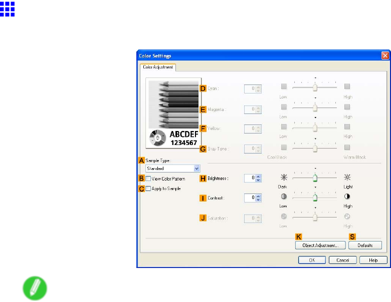 • T o display the Color Adjustment sheet, on the Main sheet, click Color Settings by Color Mode in