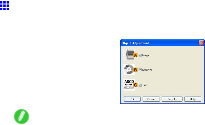 In the Object Adjustment dialog box, you can specify what type of print jobs to apply color adjustment to. If