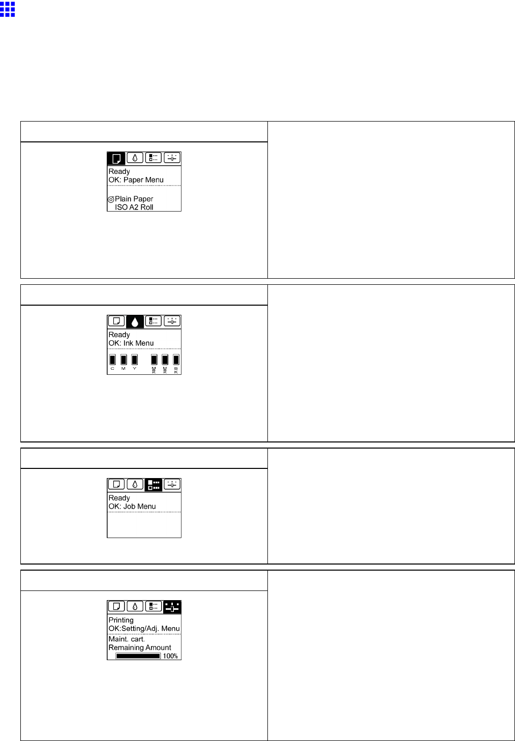 The T ab Selection screen presents four tabs. Each tab is represented by an icon in the top row . Press