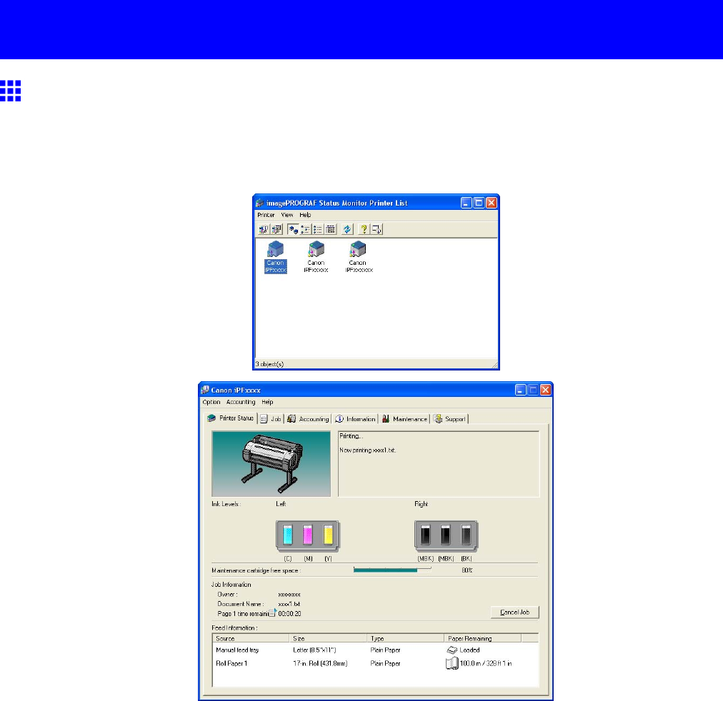T wo screens are available in imagePROGRAF Status Monitor : “Printer List” shows a list of printers, and