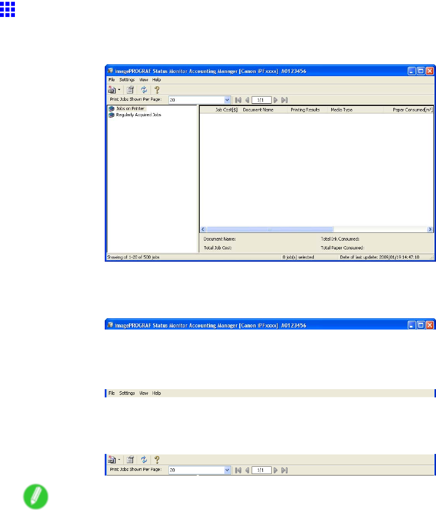The Accounting Manager main window consists of a title bar , menu bar , toolbars, listed job selection area, job list