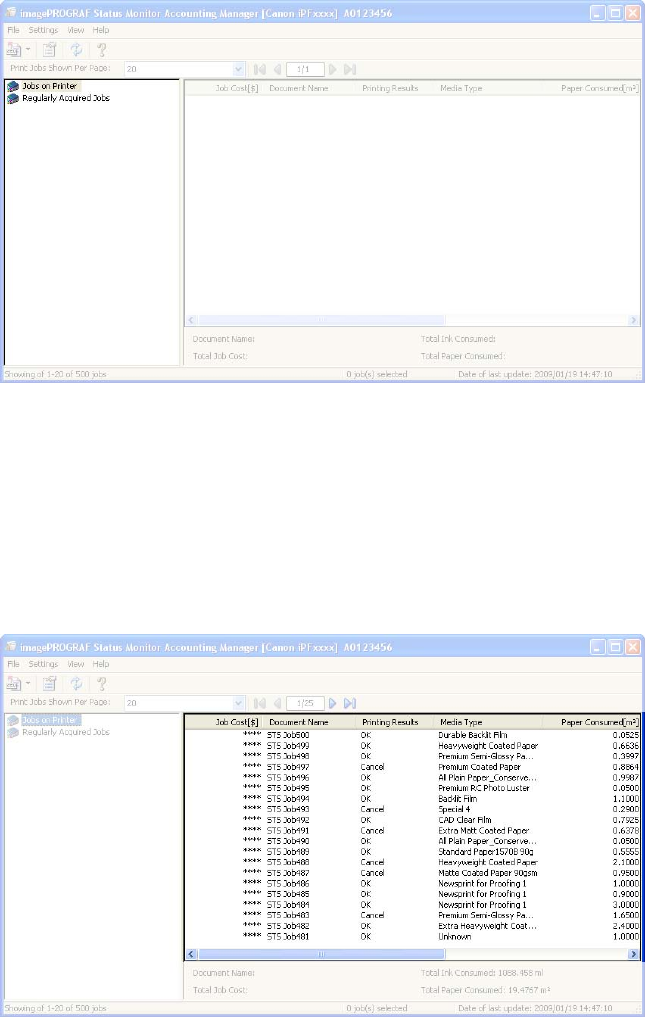 It displays a list of either the print jobs on the printers or the regularly acquired print jobs. The displayed