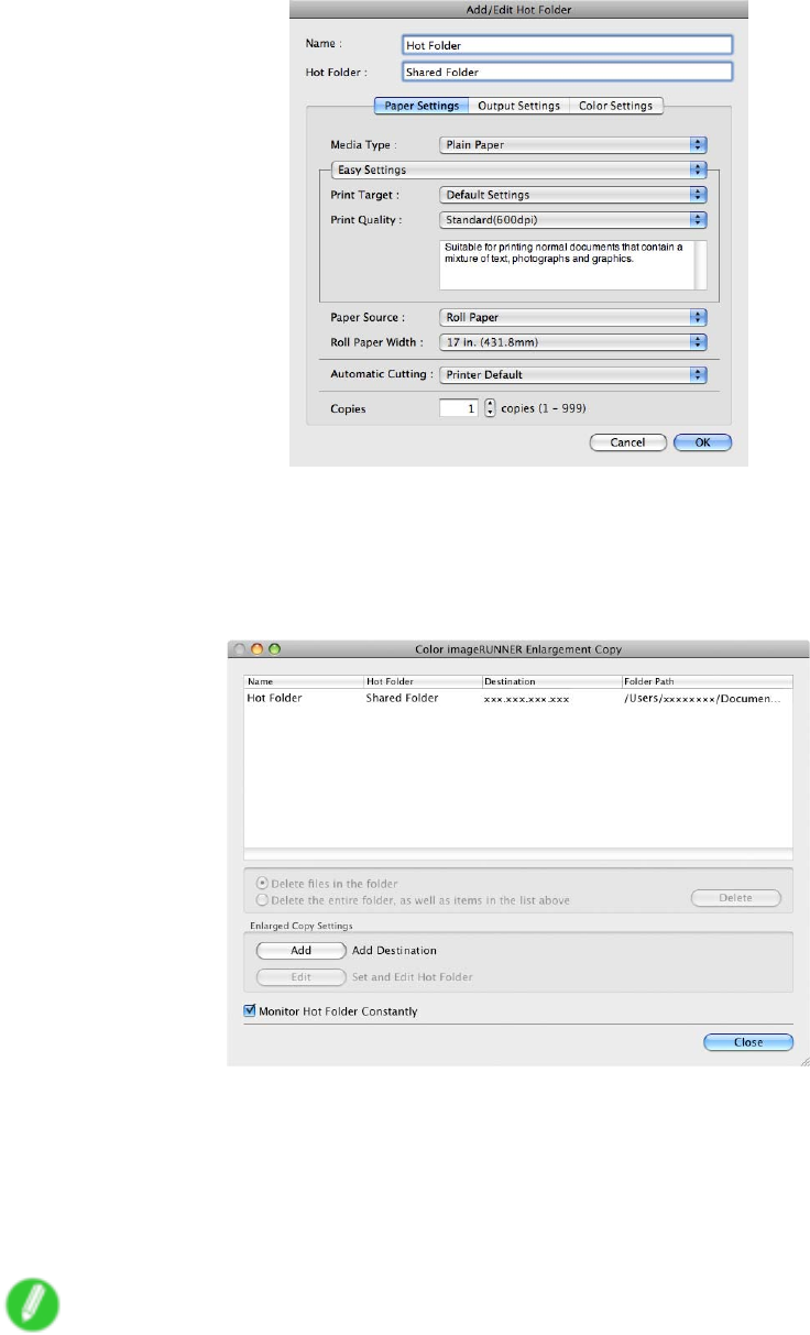 7. Click the “OK” button. The created Hot Folder is listed in the “Color imageRUNNER Enlargement