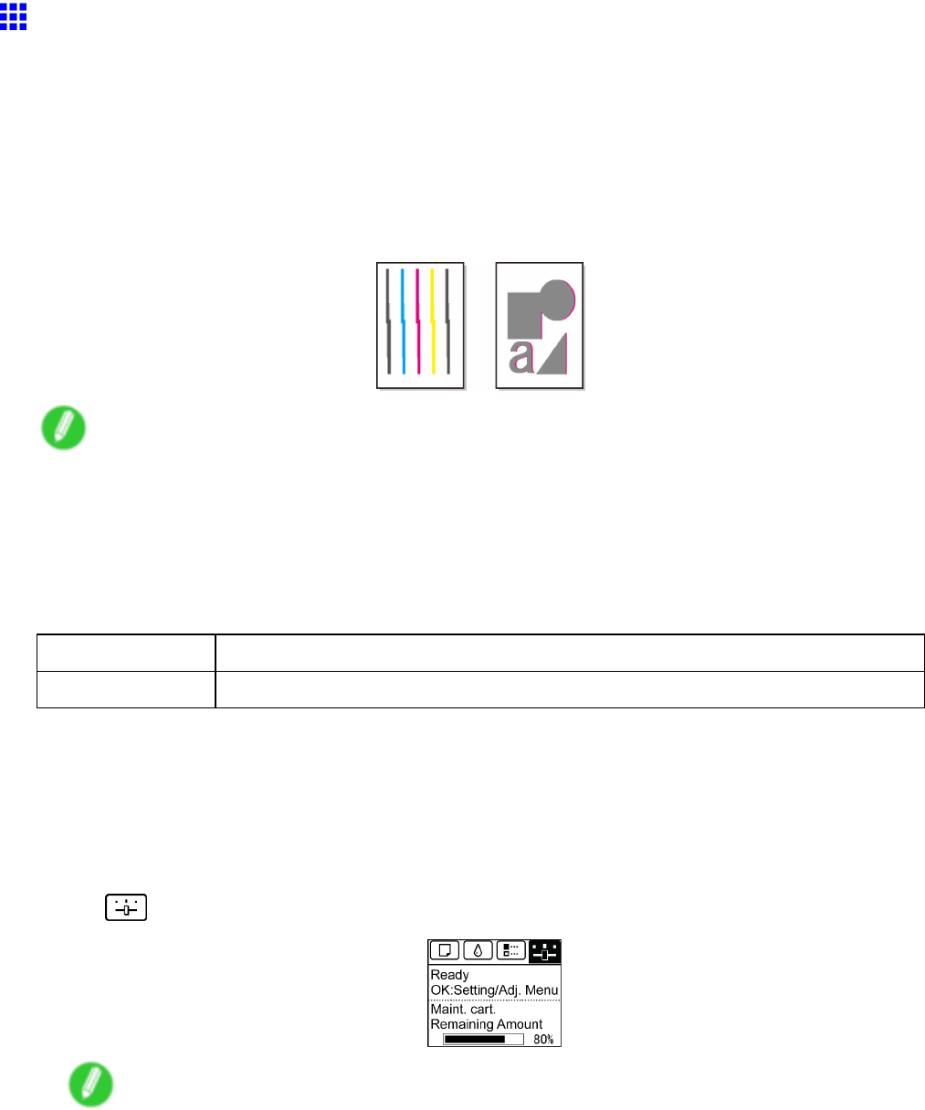 If printed vertical lines are warped or colors are out of alignment, execute Head Posi. Adj. to adjust the Printhead