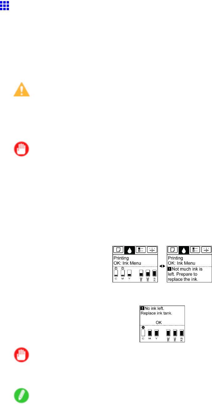 Y ou can replace ink tanks if the Display Screen advises you to check the amount of ink left or replace ink tanks.