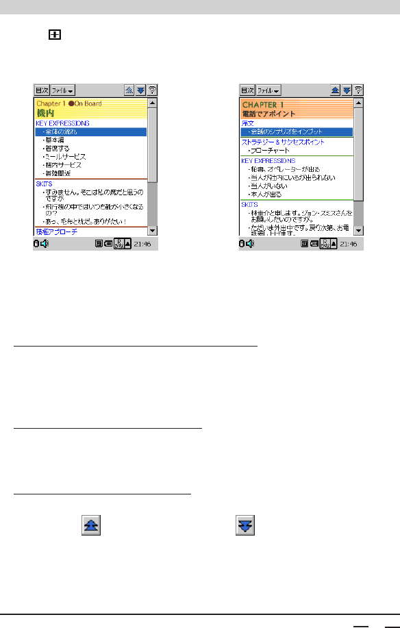 サブ目次画面で をタップするとひとつ前の章、 をタップすると次の章のサブ目次