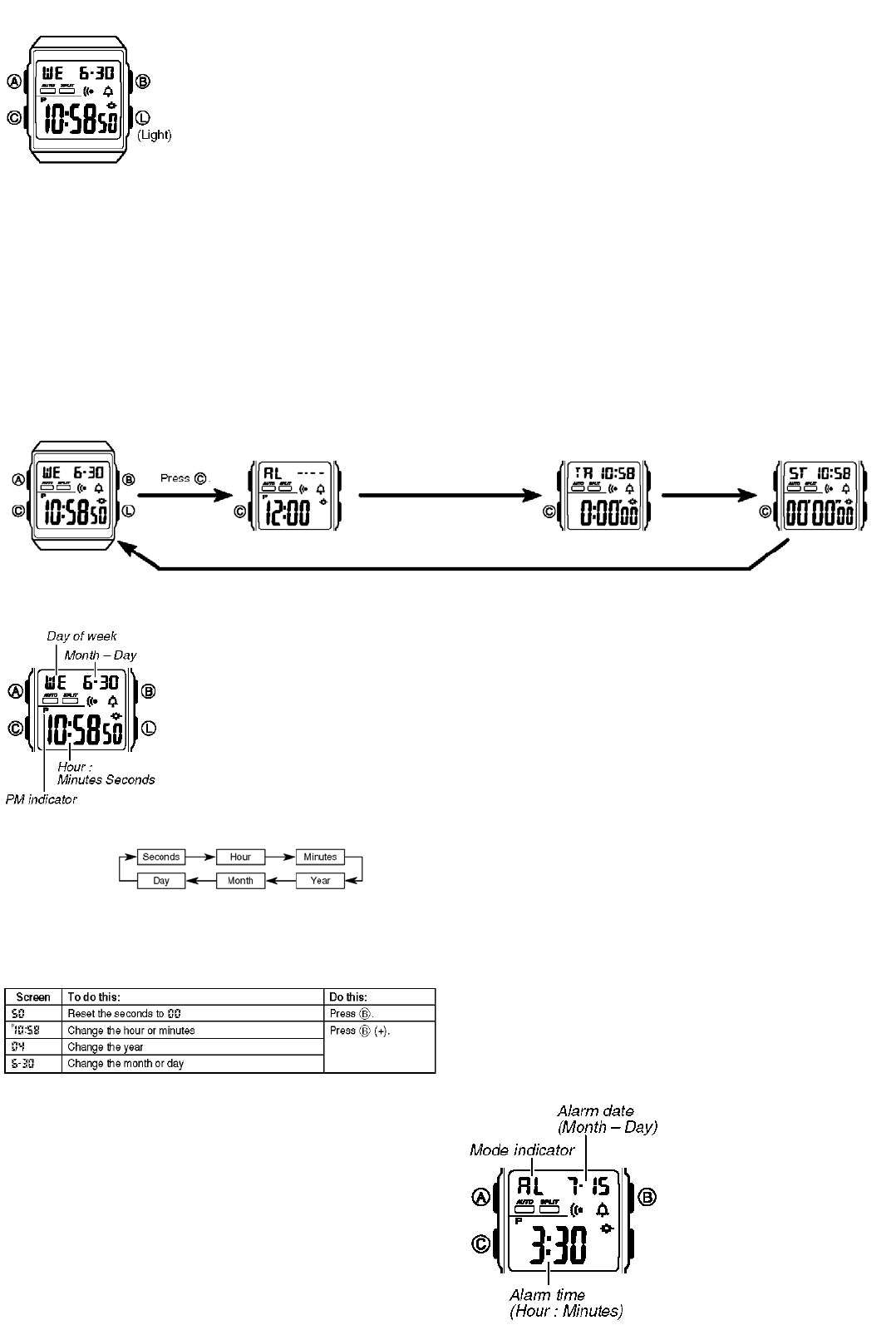 * Trykkes B mens sekundene er mellom 30 og 59,
