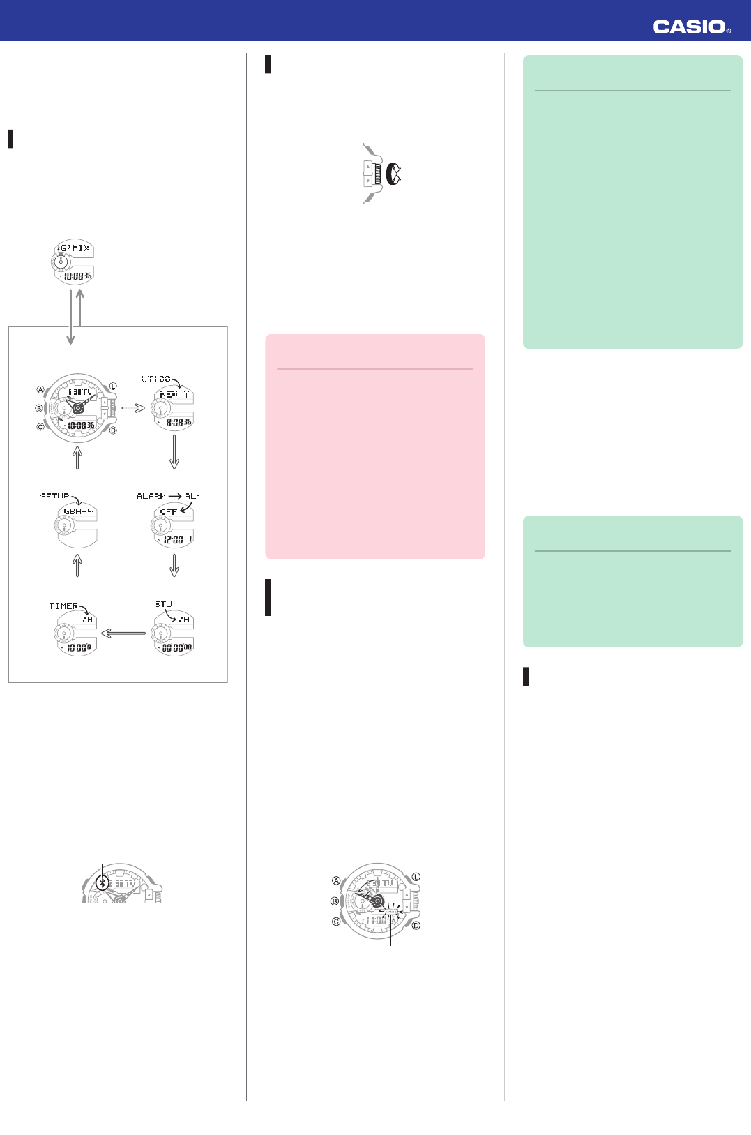 © 2014 CASIO COMPUTER CO., LTD. MA1409-B 操作ガイド 5413 基本的な操作 ロータリースイッチを使う 以下は、各モードで共通の操作です。 参考 ロータリースイッチを回すと、各モード で設定を変更できます。 ● モードを切り替える ● この時計には、7 つのモード(機能)があ ります。モードは以下の順で切り替わり ます。 コントロール モード * ● ● 素早く 3 度回すと早送り/早戻しがで ワールドタイム モード ● C セットアップ モード アラーム モード ● タイマー モード ストップウオッチ モード C モードの切り替えは C ボタンで行いま す。 ただし、 コントロールモードへの切り 替えは、B ボタンを約 0.