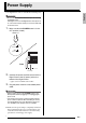 Power Supply English Your Digital Piano runs on standard household power. IMPORTANT! • Be sure to turn off power whenever you are not using the Digital Piano. Placing the cover on the Digital Piano while power is on can cause internal circuitry to over heat and lead to the risk of fire. 1. Make sure that the POWER button is in the OFF position (raised). POWER button ON (Power lamp on) OFF (Power lamp off) Front Power lamp 2.
