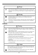 Danger • Never expose the battery pack to direct flame, do not throw it into fire, fresh water, or seawater. Doing so can damage the built in safety and protection mechanisms, and cause battery fluid to ignite, creating the danger of fire and explosion. Warning • Should fluid from the battery pack ever accidentally get into your eyes, do not rub them. Rinse your eyes with tap water and then consult your physician immediately.