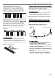 Работа с цифровым пианино ■ Как к звукам добавить хорус Применение эффектов Данное цифровое пианино располагает рядом эффектов, которые обеспечивают изменение резонанса звуков (реверберация), и эффектов, которые придают звукам большую глубину и широту (хорус). C1 C2 C3 C4 2 0 1 C5 C6 C7 C8 4 3 клавиши [0] (E4) — [4] (A}4) клавиша [+] (E}4) клавиша [–] (D4) клавиша «REVERB» (E}5) клавиша «CHORUS» (E5) ■ Как к звукам добавить реверберацию 1.