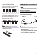 Översikt och inställningar • Observera de viktiga föreskrifterna nedan för att undvika skador på nätkabeln. Under användning • Ryck inte alltför hårt i kabeln. • Ryck inte i kabeln upprepade gånger. • Undvik att tvinna kabeln vid basen av uttaget eller kontakten. Under rörelse • Koppla alltid bort nättillsatsen från nätuttaget innan digitalpianot flyttas. Under förvaring • Rulla ihop och bind fast nätkabeln, men linda den aldrig runt nättillsatsen.