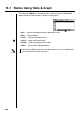 15-4 Editing Tables and Drawing Graphs You can use the table menu to perform any of the following operations once you generate a table. • Change the values of variable x • Edit (delete, insert, and append) rows • Delete a table • Draw a connect type graph • Draw a plot type graph While the Table & Graph menu is on the display, press 6 (TABL) to display the table menu. • {FORM} ... {display function list} • {DEL} ... {delete table} • {ROW} ... {display menu of row operations} P.128 • {G·CON}/{G·PLT} ...