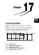 Chapter 17 List Function A list is a kind of container that you can use to store multiple data items. This calculator lets you store up to six lists in a single file, and up to six files in memory. Stored lists can be used in arithmetic, statistical, and matrix calculations, and for graphing. Element number 1 2 3 4 5 6 7 8 17-1 17-2 17-3 17-4 17-5 Display range Cell Column List 1 56 37 21 69 40 48 93 30 List 2 1 2 4 8 16 32 64 128 List 3 107 75 122 87 298 48 338 49 List 4 3.5 6 2.1 4.4 3 6.8 2 8.
