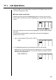 17-4 Arithmetic Calculations Using Lists You can perform arithmetic calculations using either two lists or one list and a numeric value. List Numeric Value + − × ÷ ListAns Memory List = Numeric Value Calculation results are stored in ListAns Memory. List k Error Messages • A calculation involving two lists performs the operation between corresponding cells. Because of this, an error occurs if the two lists do not have the same number of values (which means they have different “dimensions”).
