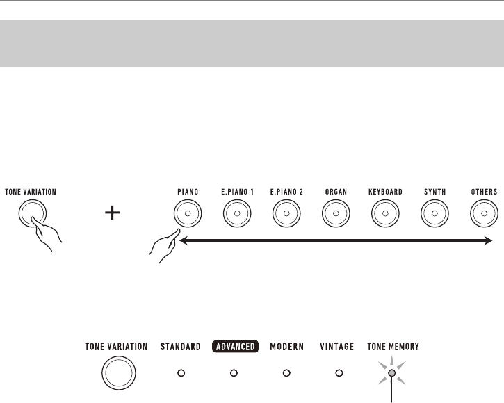 • На выбор тембра указывает то, что горят светодиод «TONE MEMORY» в группе «TONE