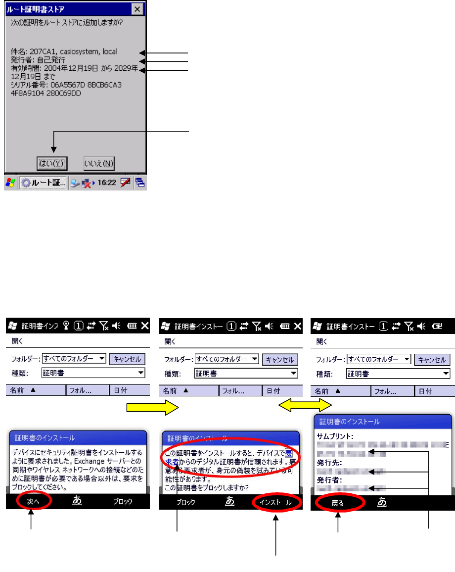 CE OS は、ルート証明書ストアの確認画面が表示されます。