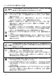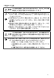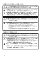 ●電池のご注意 警告 この表示を無視して誤った取り扱いをすると、人が死亡または重 傷を負う可能性が想定される内容を示しています。 • ボタン電池は、充電や分解・ショートの恐れのあることはしないでく ださい。また、ハンダ付けや加熱したり、火の中や水の中へ投入した りしないでください。 • 本機で使用しているボタン電池を取り外した場合は、誤ってボタン電 池を飲むことがないようにしてください。特に小さなお子様にご注意 願います。 • 電池は小さなお子様の手の届かない所へ置いてください。万一、お子 様が飲み込んだ場合は、直ちに医師と相談してください。 • 電池からもれた液が目に入ったときは、こすらずにすぐにきれいな水 で洗い流し、直ちに医師の治療を受けてください。 注意 この表示を無視して誤った取り扱いをすると、人が傷害を負う可 能性が想定される内容および物的損害のみの発生が想定される内 容を示しています。 • 電池は使いかたを誤ると液もれによる周囲の破壊や、破裂による火 災・けがの原因となります。次のことは必ずお守りください。 • 極性(+と−の向き)に注意して正しく入れてください。 • 長時間使用しな